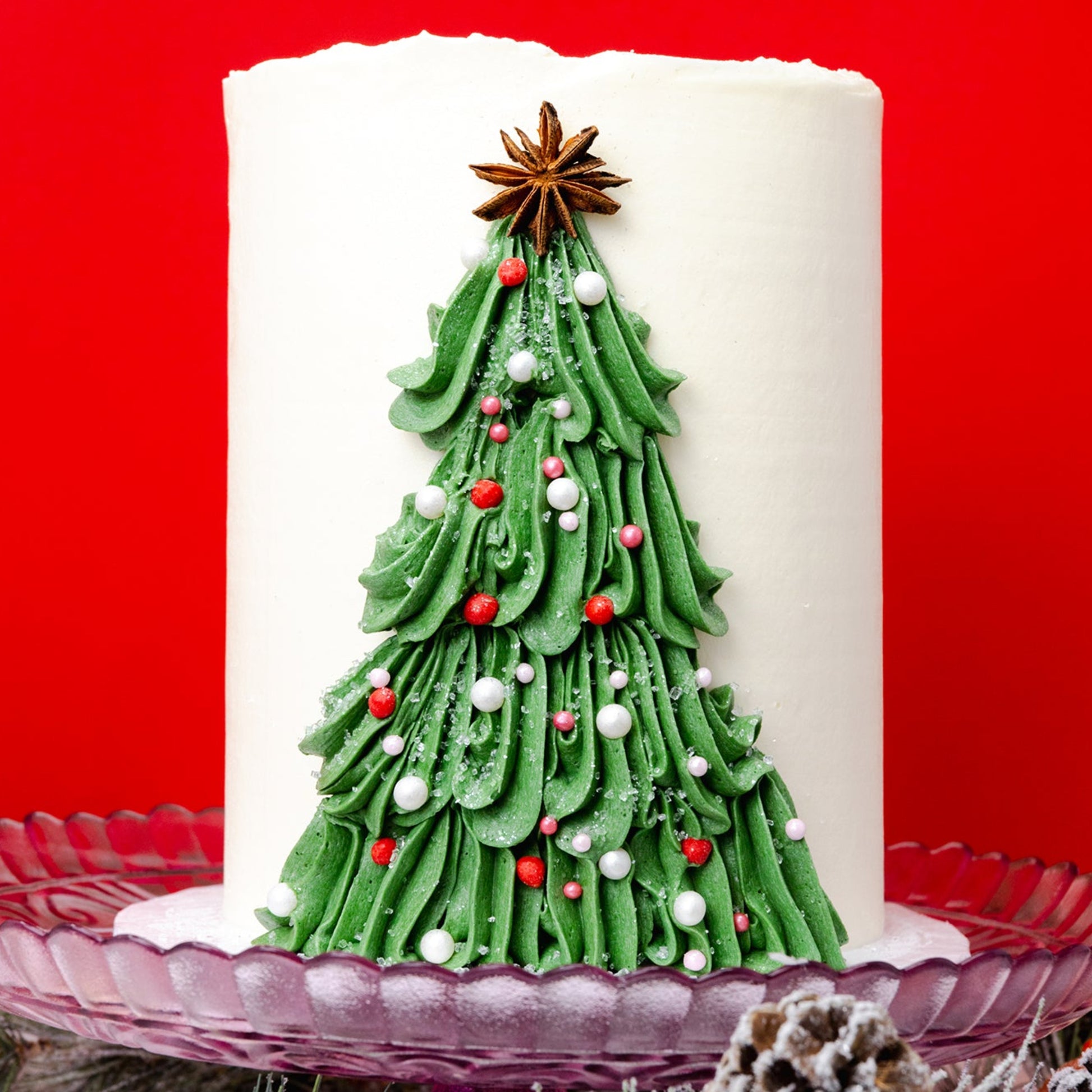 An adorable Christmas tree decorated cake. Three layers of fresh baked cake in the flavour of your choice. Decorated with delicious buttercream.